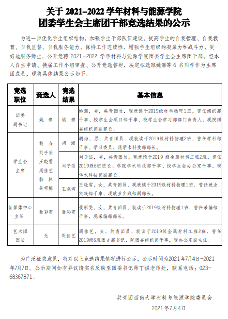 关于2021-2022学年伟德体育团委员工会主席团干部竞选结果的公示