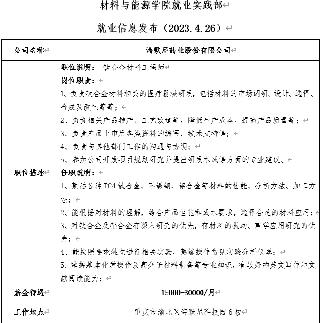 就业信息发布(2023.4.26)——海默尼药业股份有限公司