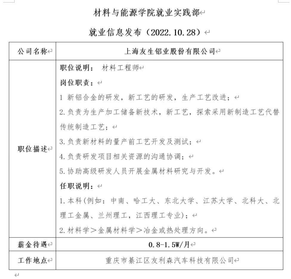 就业信息发布(2022.10.28)—上海友生铝业股份有限公司