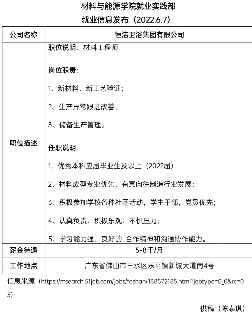 就业信息发布(2022.6.7)----- 恒洁卫浴集团有限公司
