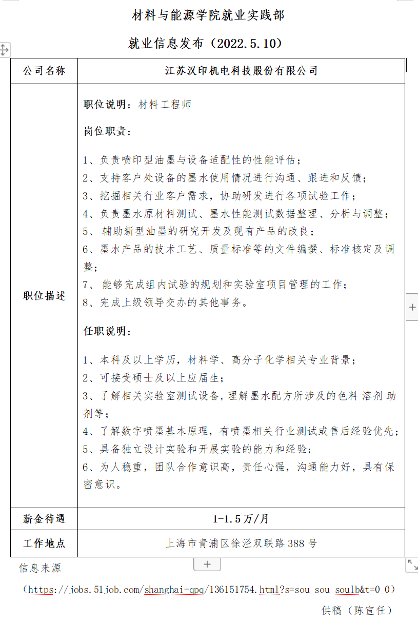 就业信息发布(2021.5.10)—江苏汉印机电科技股份有限公司