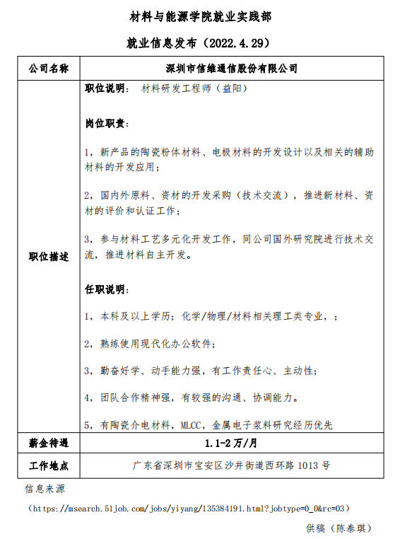 就业信息发布 2022.4.29 —深圳市信维通信股份有限公司