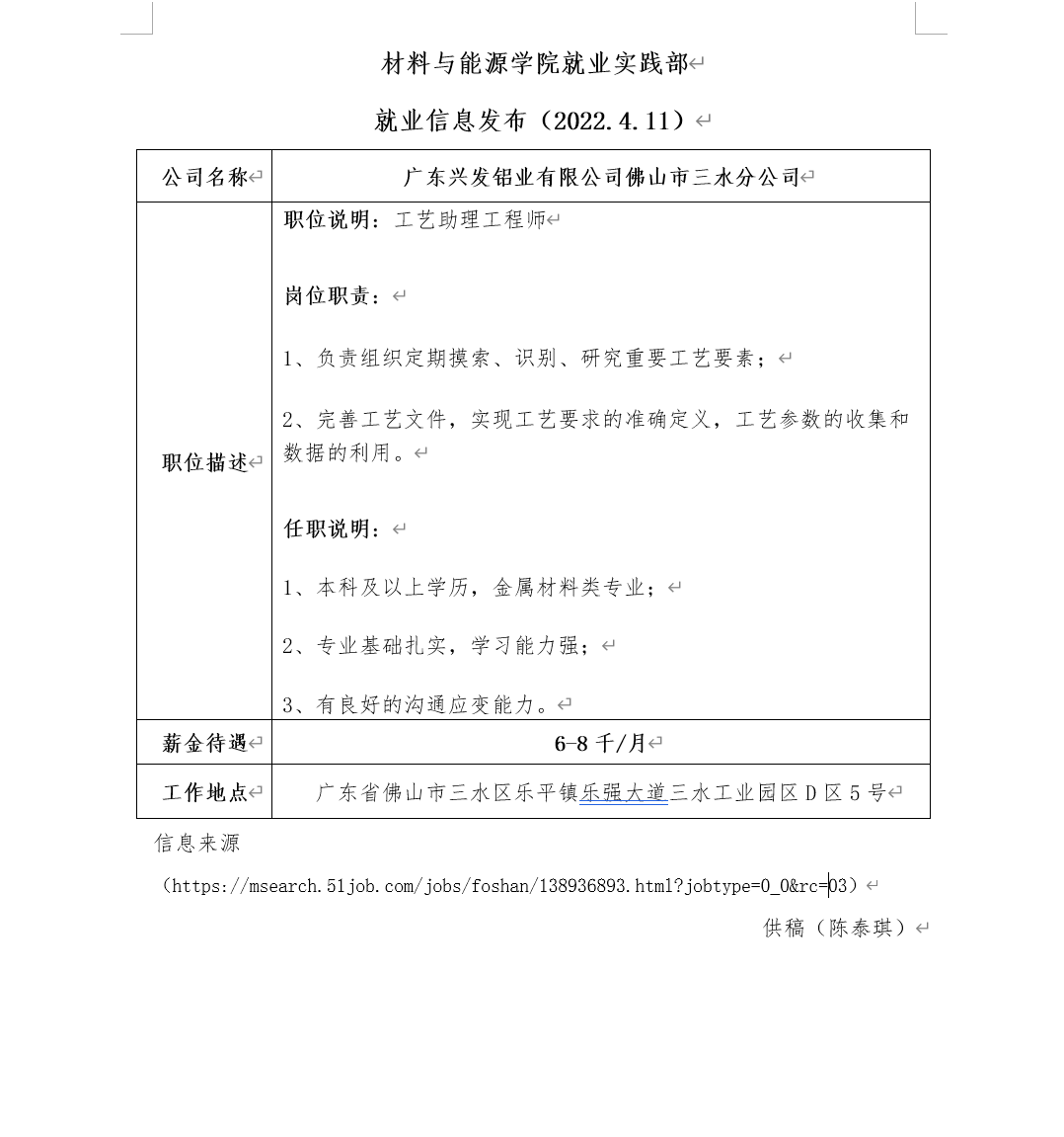 就业信息发布(2022.4.11)——广东兴发铝业有限公司佛山市三水分公司