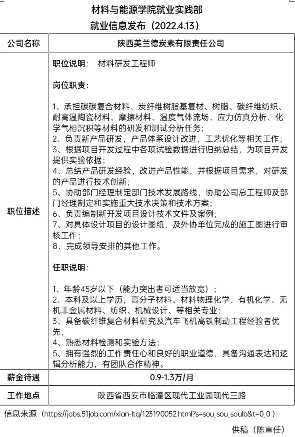 就业信息发布(2022.04.13)——陕西美兰德炭素有限责任公司