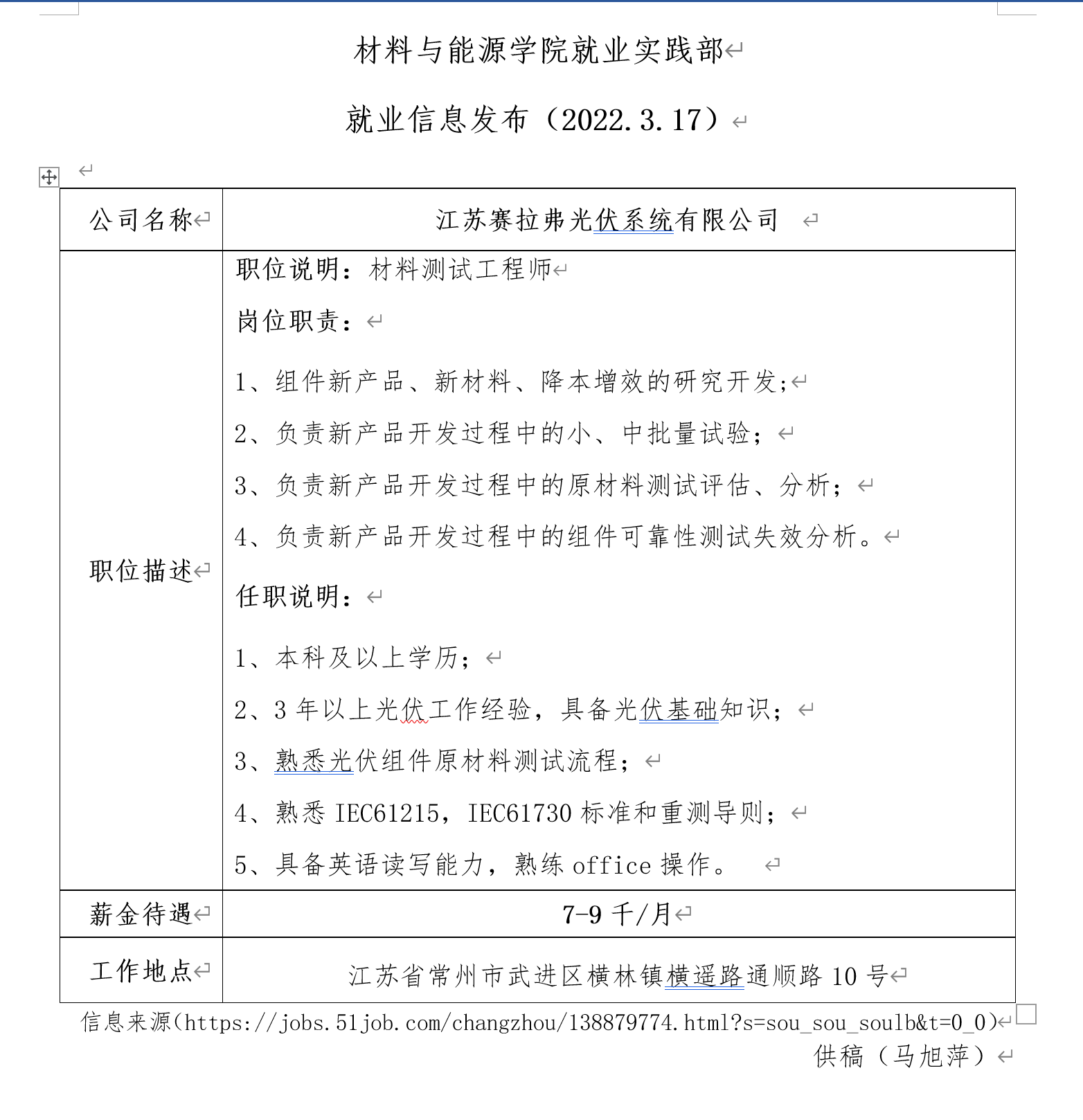 就业信息发布(2022.03.18)江苏赛拉弗光伏系统有限公司