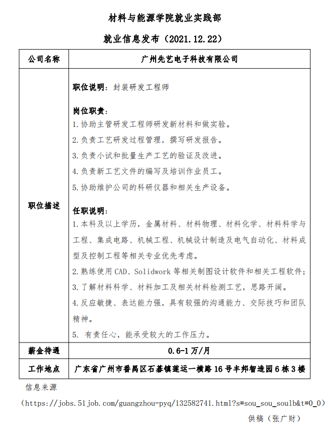 就业信息发布(2021.12.26)—广州先艺电子科技有限公司