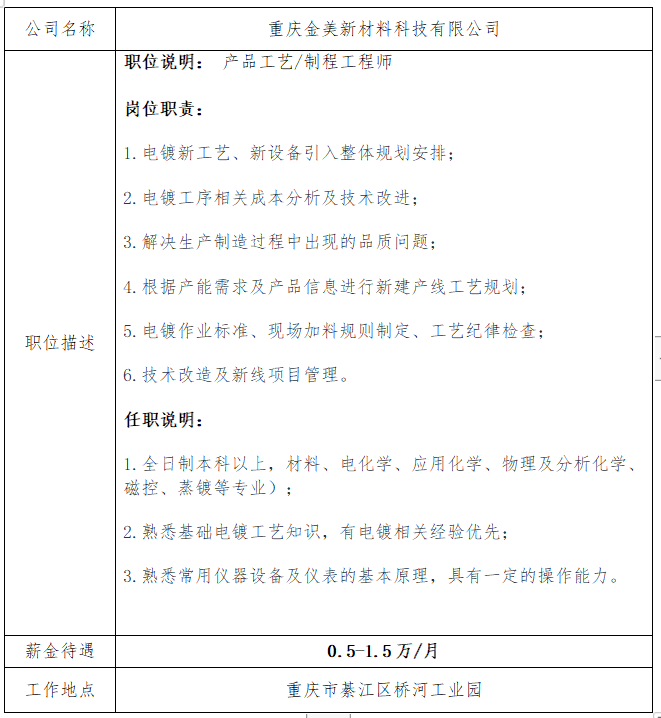 就业信息发布2021.6.18--重庆金美新材料科技有限公司