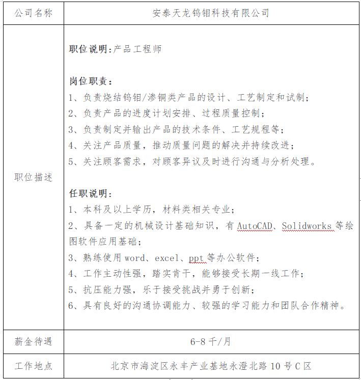 就业信息发布2021.5.15-安泰天龙钨钼科技有限公司