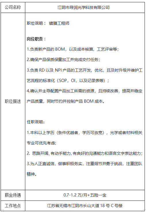 就业信息发布2021.4.25—(江阴市导润光学科技有限公司)