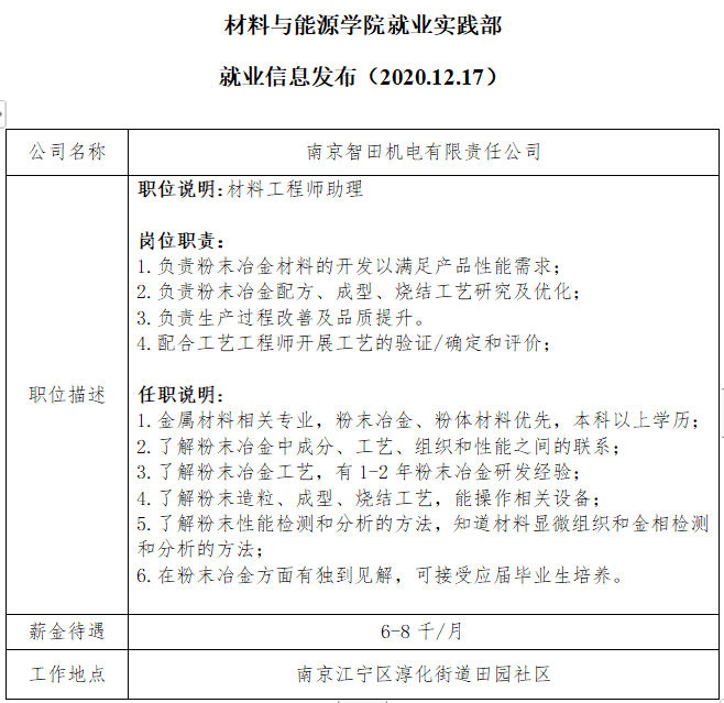 就业信息发布2020.12.17—(南京智田机电有限责任公司)