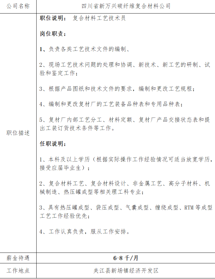 就业信息发布2020.11.9-四川省新兴碳纤维复合材料公司