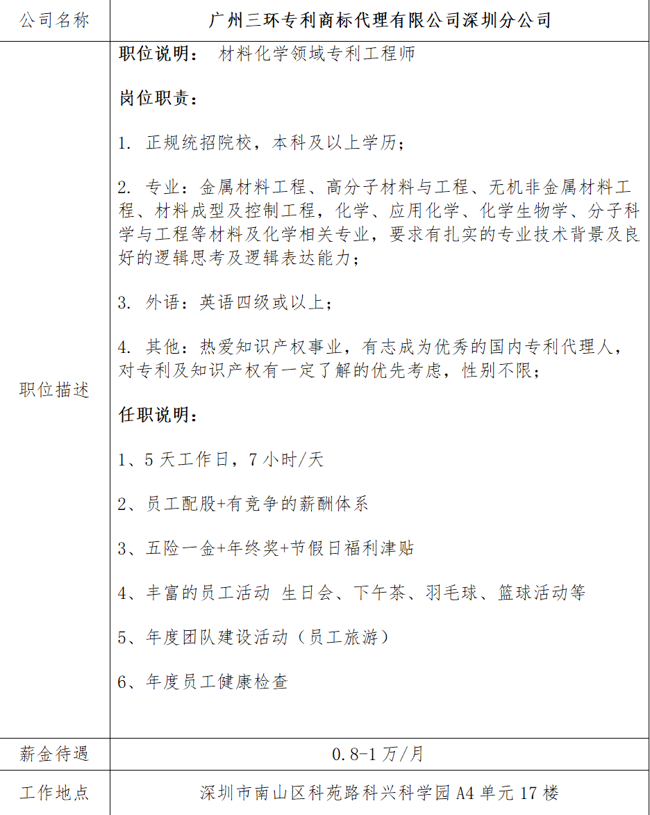 就业信息发布2020.10.16-广州三环专利商标代理有限公司深圳分公司