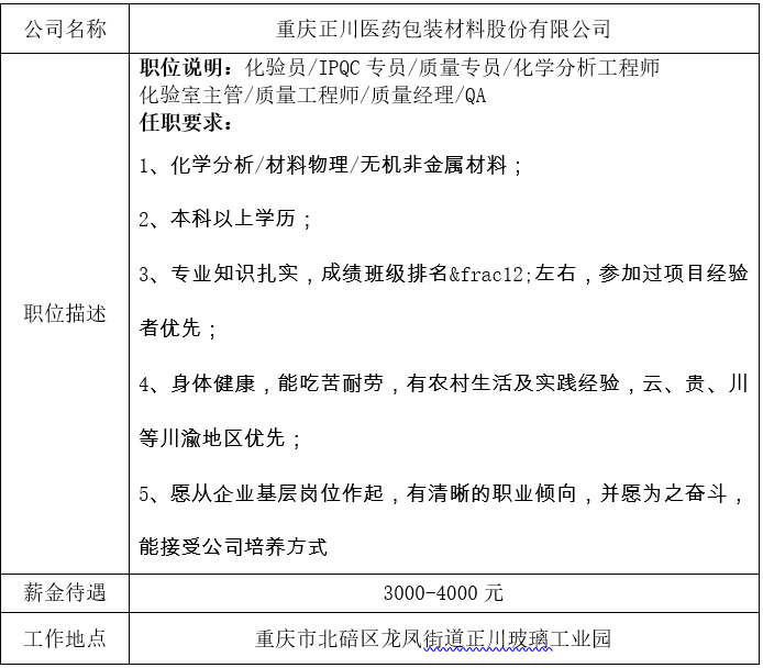 就业创业中心20180509发布-重庆正川医药包装材料股份有限公司