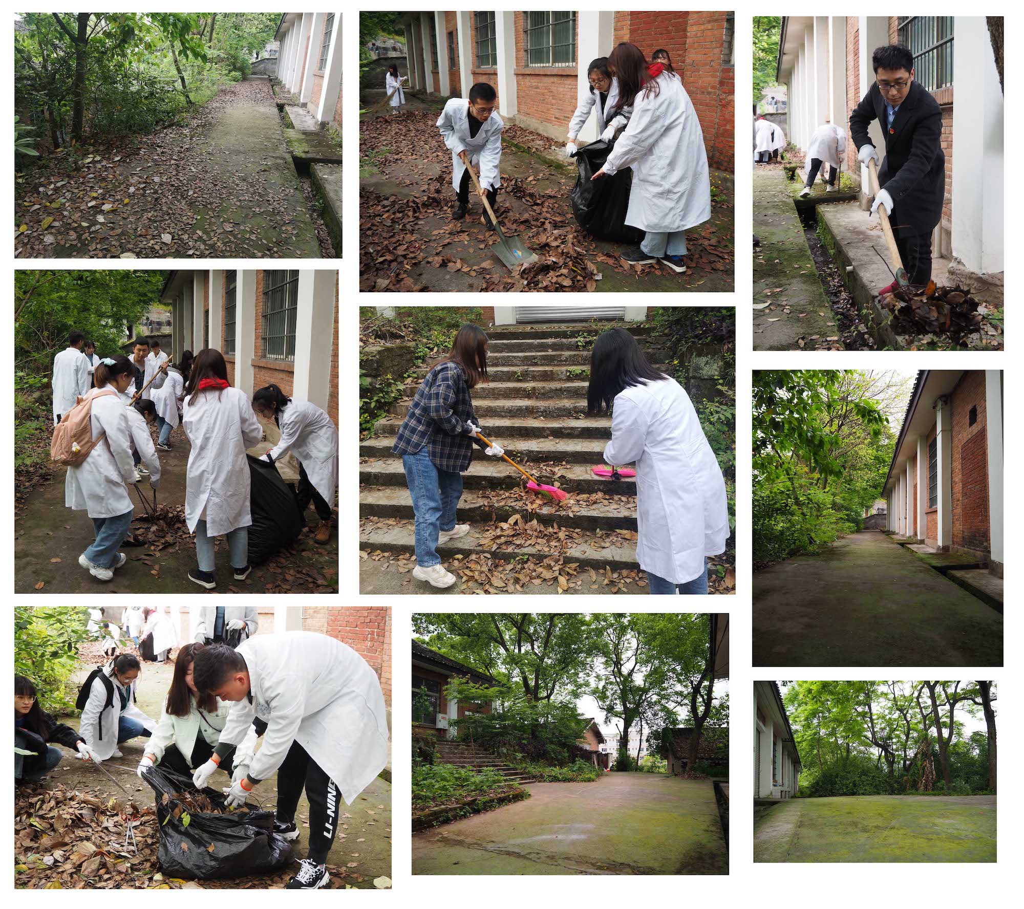 在本科生第二党支部书记谭小东同志的安排下,志愿清扫活动迅速展开。清理遍地散落的树叶,清扫沟道里的淤泥,清除实验室旁地里的杂草,同志们积极合作,干劲十足,发扬不怕脏、不怕累的精神。本次重点对麦田村实验室88教、89教外的空地、绿化带内的垃圾和杂草及楼梯沟道内的垃圾等环境卫生死角进行了彻底清理。经过两个支部师生的共同努力,麦田村实验室的面貌焕然一新。