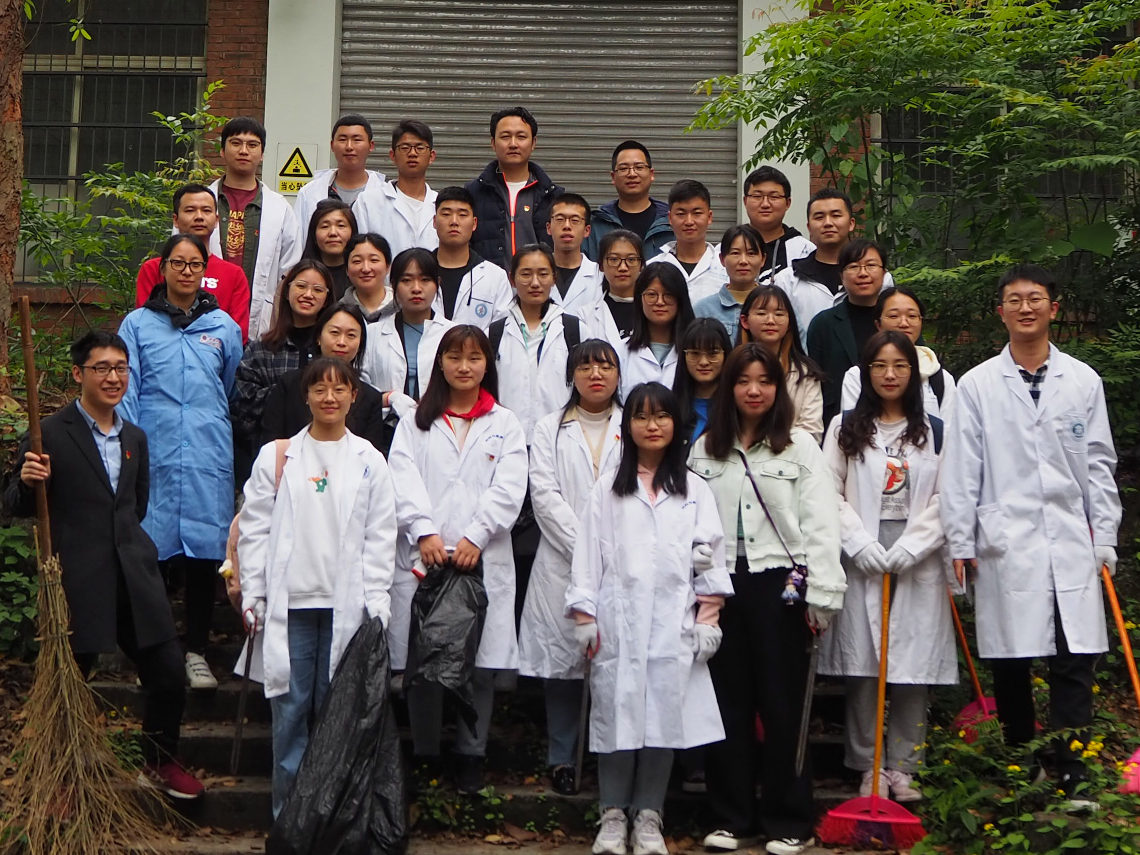 下午四时,党员们全副武装,穿上实验服,佩戴上党徽,戴好手套,准备好扫帚、簸箕、铁锹、垃圾袋等清扫工具,前往麦田村实验室。该实验室位于bevictor伟德校史馆之后,坐落于小山之上,近来主要作为公司实验室等各类大型设备的存储室。由于平时来往人员较少,加之近期树木正处于落叶期,麦田村实验室外清洁度较低,落叶散落在实验室外围,角落里淤泥遍布,绿化带杂草丛生,清理任务较重。为保持实验室的整洁干净,改善实验室工作环境,为科研人员提供良好的氛围,弘扬劳动精神,培养党员吃苦耐劳的品质,特此进行志愿清扫活动。
