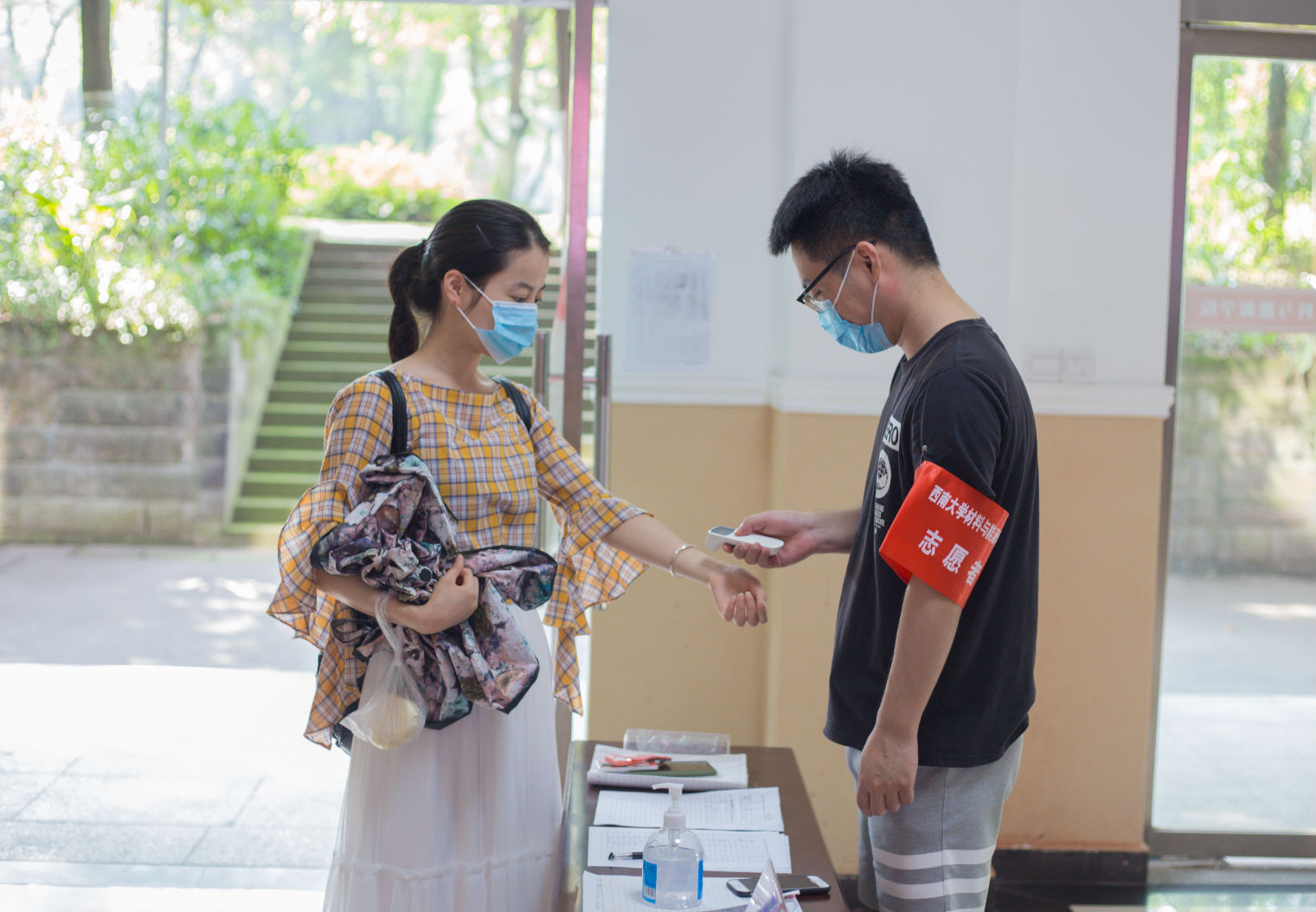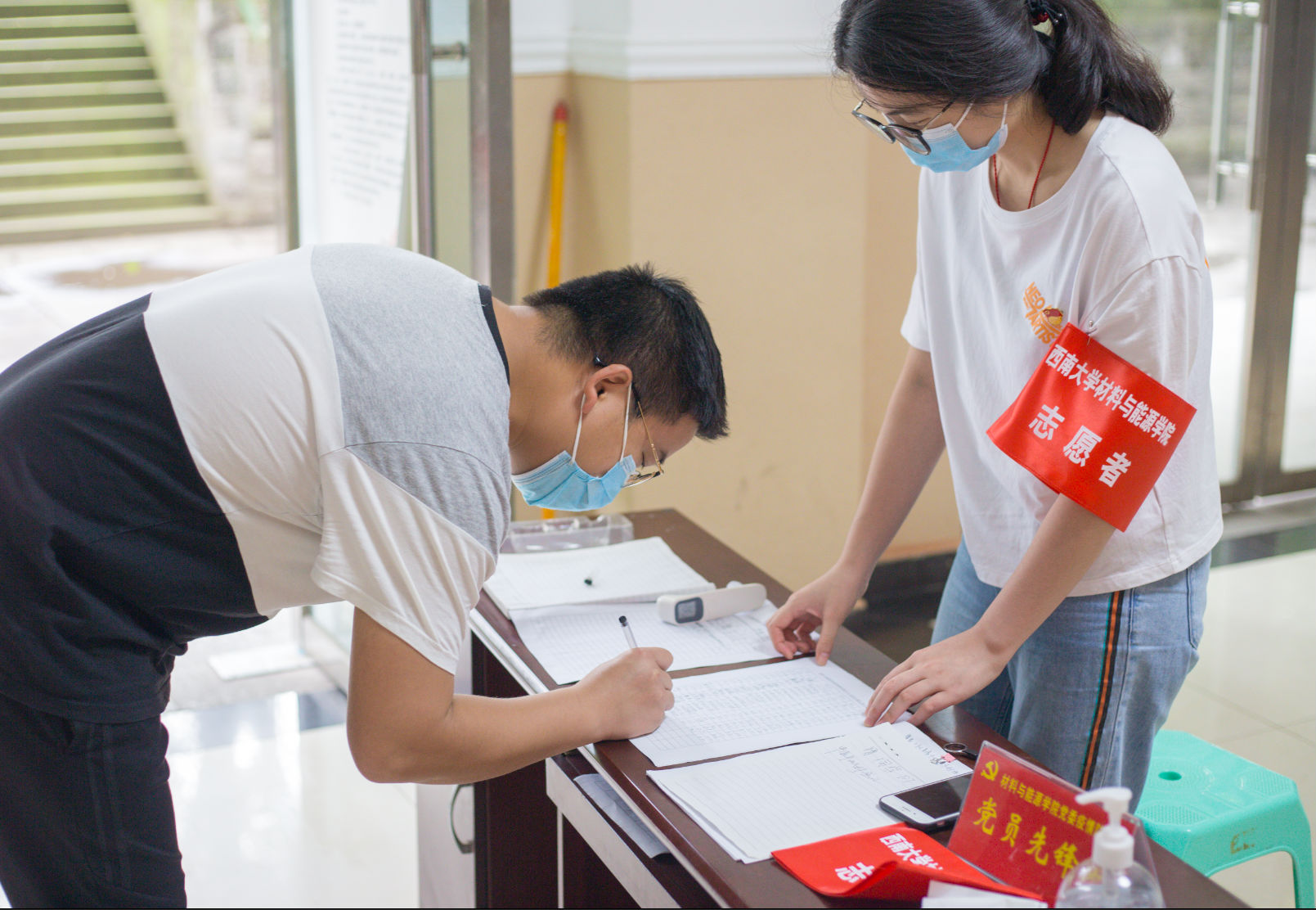 “您好,请出示一下您的校园一卡通,并主动接受体温检查测试”“请佩戴好口罩,有序排队,保持适当间距”……在伟德体育21教实验室门口,戴着“伟德体育志愿者”字样红色袖章的党员志愿者正在对进入实验室的人员依次测量体温,逐一做好登记。