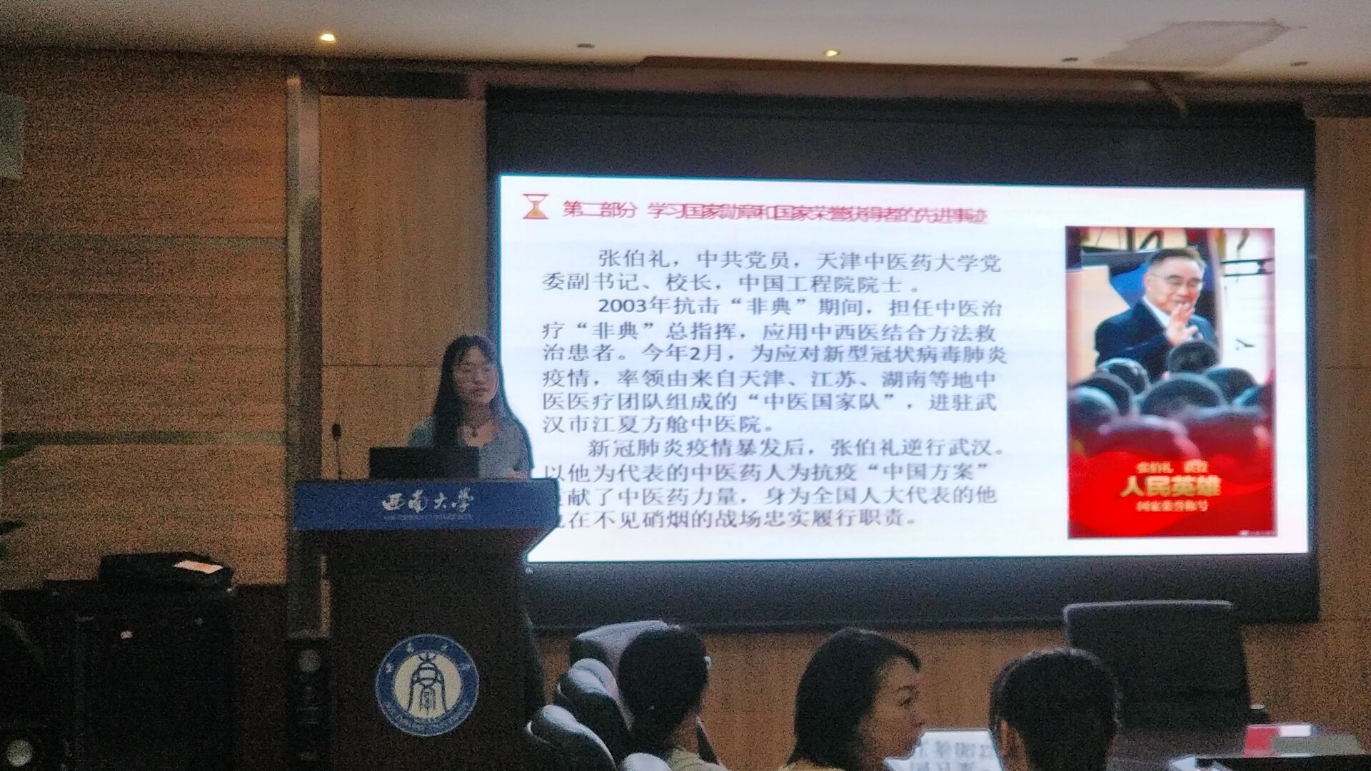 随后学习了国家勋章和国家荣誉获得者的先进事迹。共和国勋章获得者,84岁的钟南山临危受命,继非典之后,再一次成为最美“逆行者”,为中国人民打了一剂强心剂。“人民英雄”国家荣誉称号获得者张伯礼,以他为代表的中医药人为抗疫“中国方案”贡献了中医药力量。“人民英雄”国家荣誉称号获得者陈薇,在基础研究、疫苗、防护药物研发方面取得重大成果,为疫情防控作出重大贡献。“人民英雄”国家荣誉称号获得者张定宇,虽身患渐冻症,但他仍冲锋在前,身先士卒,为打赢湖北保卫战、武汉保卫战作出重大贡献。