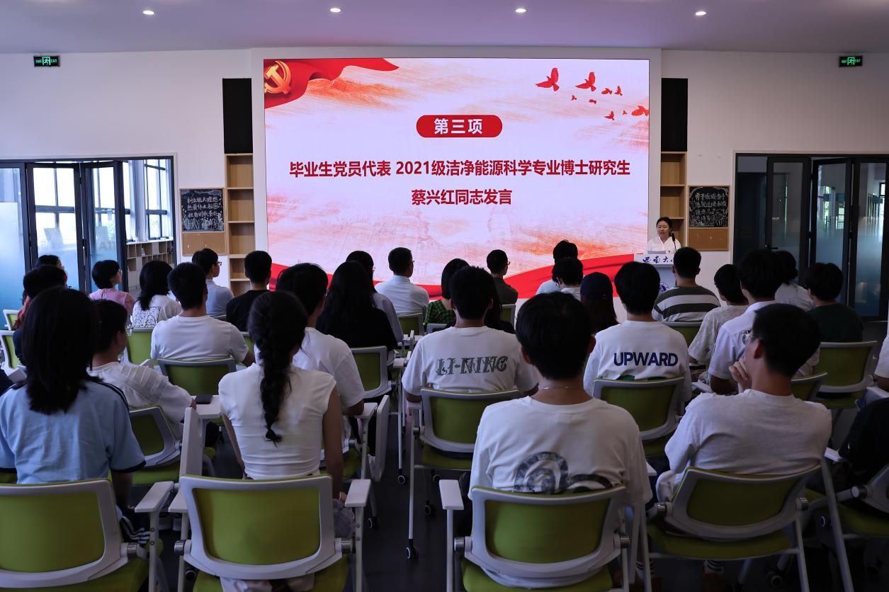2021级洁净能源科学专业博士研究生蔡兴红作为毕业生党员代表分享了她的成长感悟。她以“青春何处闪光”为主题,讲述了自己在科研、党建和志愿服务中的经历。科研路上,她曾因难题迷茫、因拒稿受挫,但秉持 “将论文写在祖国大地上” 的信念,最终收获 10 篇 SCI 论文,并获国家留学基金委资助赴比利时联合培养。担任党支部宣传委员五年间,她与支委们挑灯夜战确保组织关系 “零差错” 转接,用行动诠释 “把每一件小事做到极致” 的党建初心。疫情期间,她化身 “西小兰” 志愿者守护校园平安,在乡村振兴中与农户共收青菜头,深刻体会到 “共产党员要能在实验室沉心研究,也能在人民需要时站出来”。她号召全体毕业生党员铭记党员身份,在各自岗位发光发热。