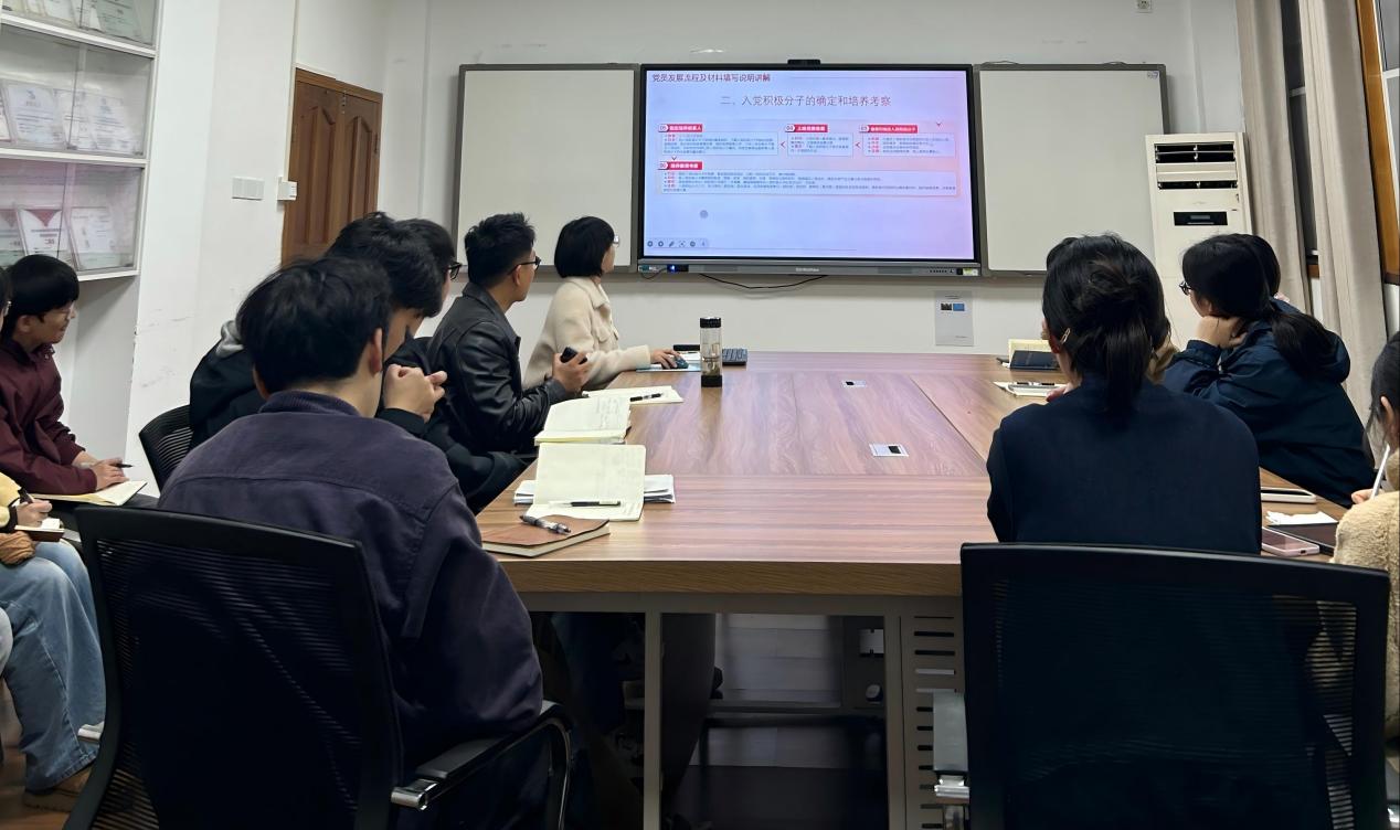 培训交流会紧扣基层党建工作重点难点,聚焦实用性与针对性,分模块开展系统培训。在党员发展流程及材料填写规范环节,居媛悦结合《中国共产党发展党员工作流程图》,从申请入党、入党积极分子的确定和培养教育、发展对象的确定和考察、预备党员接收、预备党员的教育考察和转正五个关键环节,进行了全流程、精细化讲解。针对材料填写中常见的格式不规范、内容不完整、逻辑不清晰等问题,通过填写模版展示,逐一拆解《入党积极分子培养教育考察登记簿》《预备党员教育考察登记簿》《入党志愿书》等核心材料的填写要点,明确时间节点、责任主体和注意事项,强调党员发展工作的严肃性、规范性和程序性,确保每一位参训人员都能准确掌握材料撰写的标准和要求。