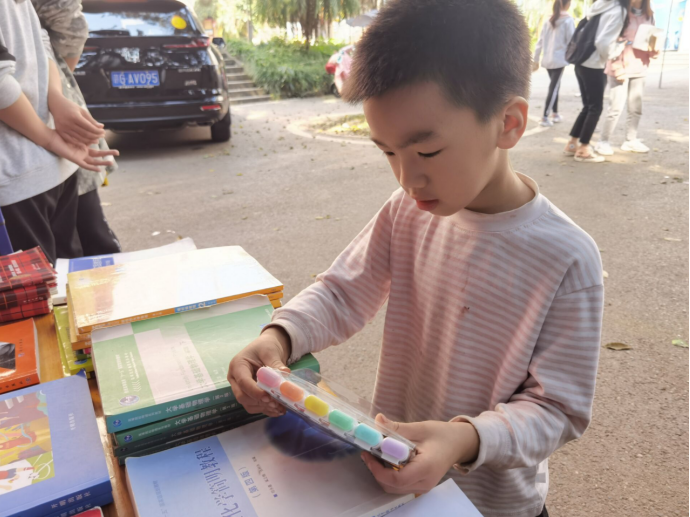 活动过程中,志愿者们积极邀请同学们拿出闲置物品进行互换,填写爱心便利贴,记录活动精彩瞬间。同学们用书立换取拼图,用护手霜换取眼镜盒,用四级考题集换取《羊皮卷》书籍……小朋友也愿意将指甲刀换取荧光笔。考虑到无家长陪同,为小朋友交换物品欠妥,志愿者们主动将荧光笔赠送给小朋友,大家都沉浸在温暖友爱的活动氛围中。