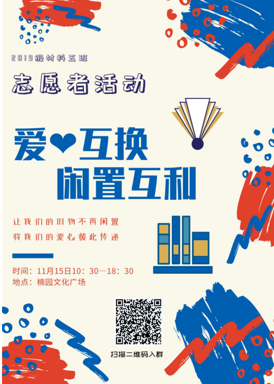 希望在此次活动中,同学们在交换闲置物品的同时,让物质资源得到最大程度的利用率,真正达到闲置互利的目的,也在活动过程中促进形成团结友好、互助友善的良好氛围。 (2019级材料类5班 11月15日供稿)