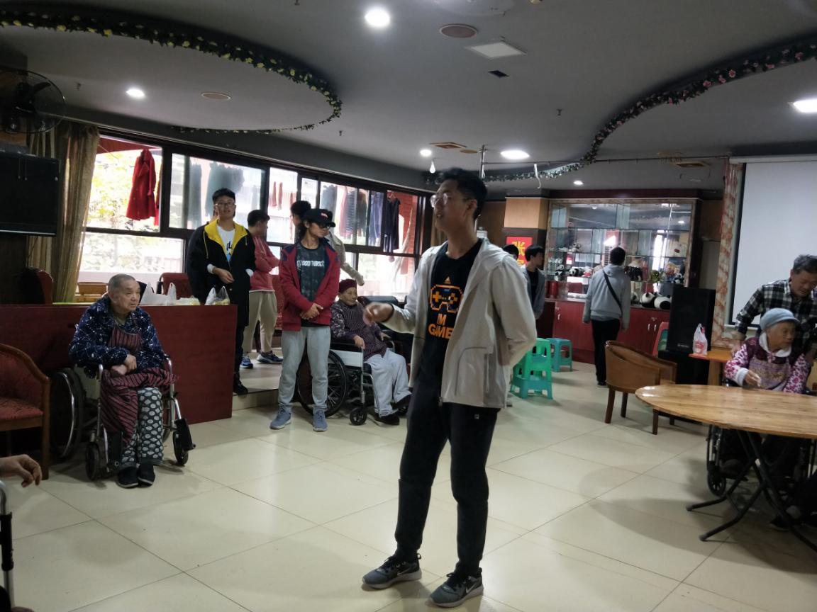 活动前期,志愿者们为老人们购买一些慰问品,外联组提前到养老院与工作人员进行对接和沟通。活动开始,班长为老人们简单地介绍参与此次活动的同学和此次活动的主要内容。老人们对志愿者们的到来表示热烈的欢迎。志愿者们相继为老人们表演了评书、健美操、歌曲等节目。