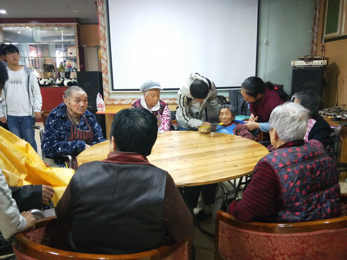 在节目间隙,志愿者来到老人身边,陪他们聊天,既谈论社会的发展,也倾听老人们诉说他们曾经的故事。午餐时刻,部分志愿者拿起汤勺喂食一些行动不便的老人,帮助他们方便地进食。