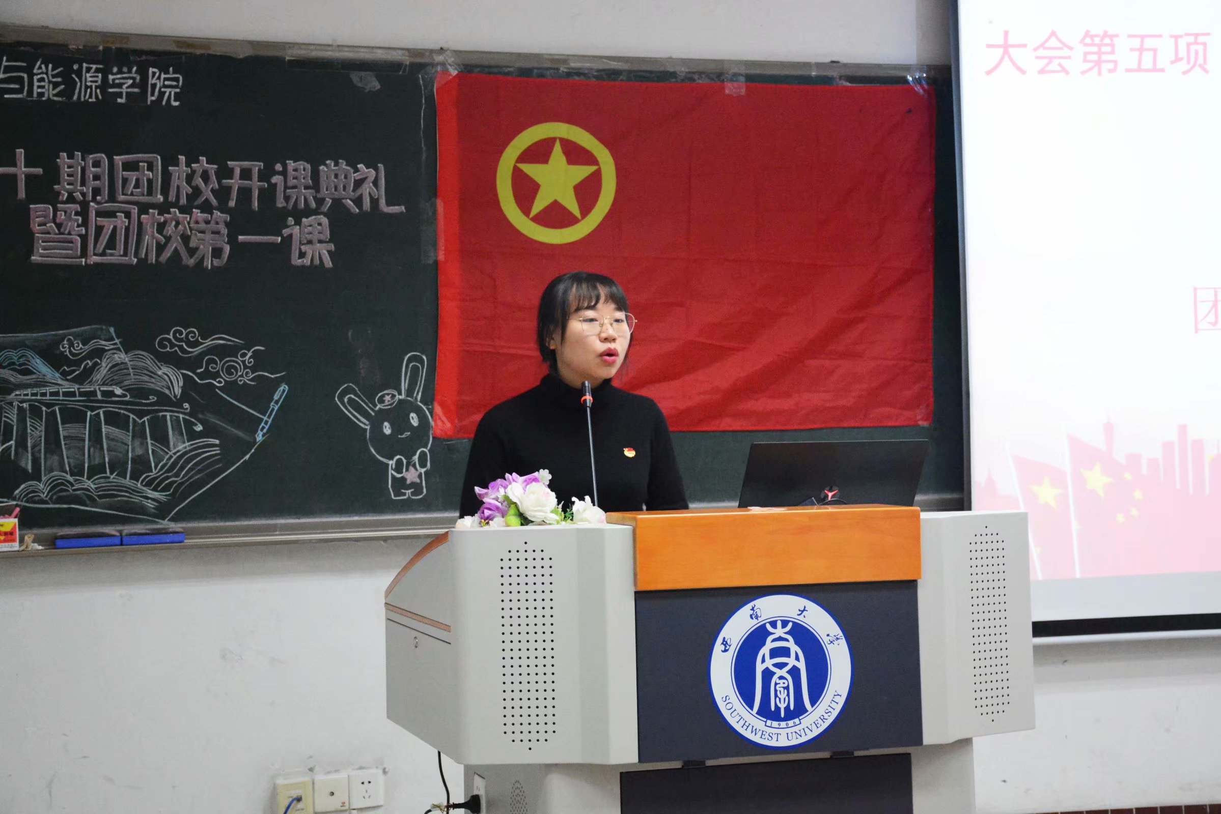 在主持人简短介绍后,仪式正式开始。在场成员起立唱国歌。随后由组织部部长程琦、第九期团校之星廖宇轩分别就团校学习的意义和方式等方面进行发言,他们的发言充分激发了在场同学对于团校学习的浓厚兴趣,也使各位同学体会到了团校学习的必要性。