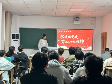 此刻是10月24日晚上19:20,宣讲团成员2021级材料物理专业张睿涵同学正走进2023级材料类4班开展主题团日活动。