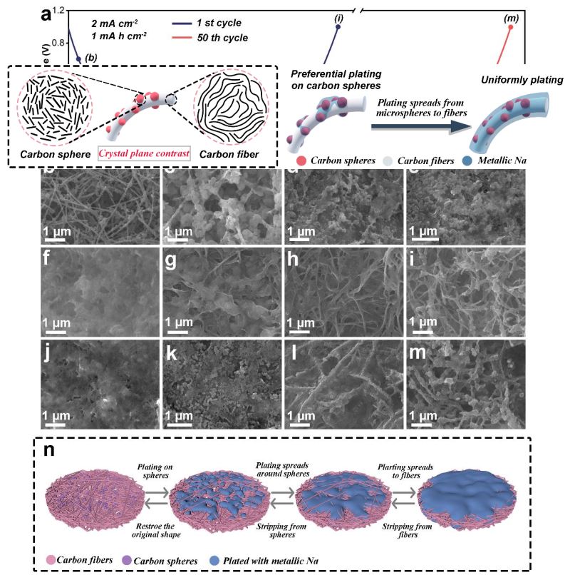 非原位扫描电镜研究结果表明,金属钠优先在石墨化程度更低和缺陷浓度更高的碳微球周围发生沉积/剥离,然后在逐渐铺展到碳纤维及电极平面上。这种梯度有序的沉积过程,可以减少金属钠的垂直生长,实现无枝晶钠金属负极。