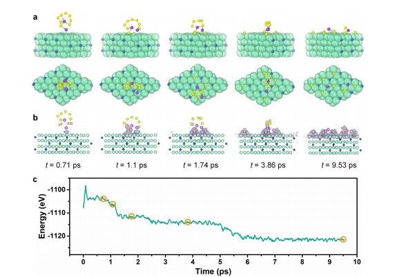 DFT计算结果表明,Fe3N对Na2S表现出极强的分子吸附,能将其有效锚定,而Fe3N对其他高阶多硫化物发生解离吸附过程,能够提高电池的反应动力学,减少多硫化物溶解,从而提高循环性能。AIMD模拟显示,在解离过程中,Na2S8的所有S原子在~9.53 ps内吸附在Fe3N表面,Na2S8分子完全解离,S原子和Fe3N之间形成新的键合作用。