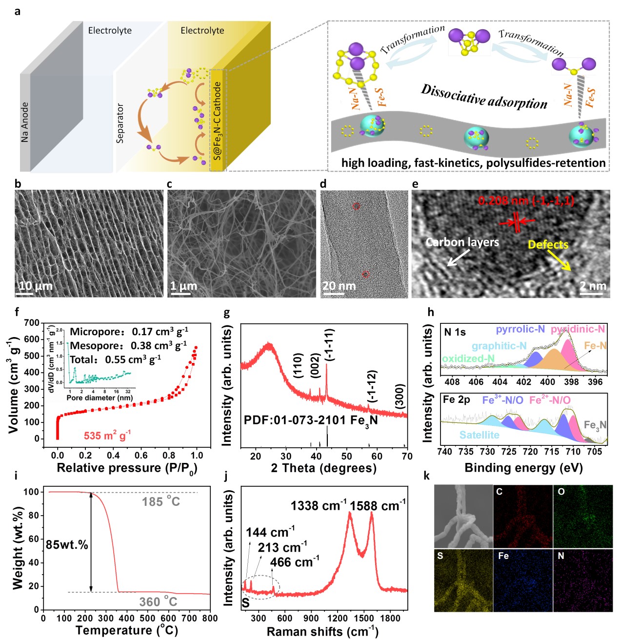 本篇论文报道利用细菌纤维素的多层网络结构,并采用氨气处理引入丰富的含氮官能团及多层级孔道结构,以实现高达85wt.%的载硫量,并且可以缓解硫的团聚及循环过程中的体积膨胀。此外,Fe3N量子点及掺杂的N原子能提高碳纤维的电子电导,同时可以通过Na-N和Fe-S键对多硫化物表现出极强的亲和力,有效地抑制了多硫化物的穿梭。