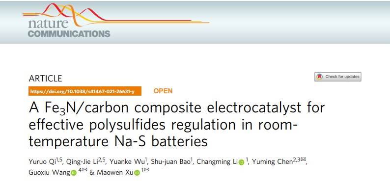 2021年11月4日,国际知名期刊《Nature Communications》在线发表了公司伟德体育徐茂文教授团队的最新研究成果“A Fe3N/carbon composite electrocatalyst for effective polysulfides regulation in roomtemperature Na-S batteries”。该成果的第一完成单位为bevictor伟德,公司博士后戚钰若为该论文的第一作者,徐茂文教授为最后通讯作者。