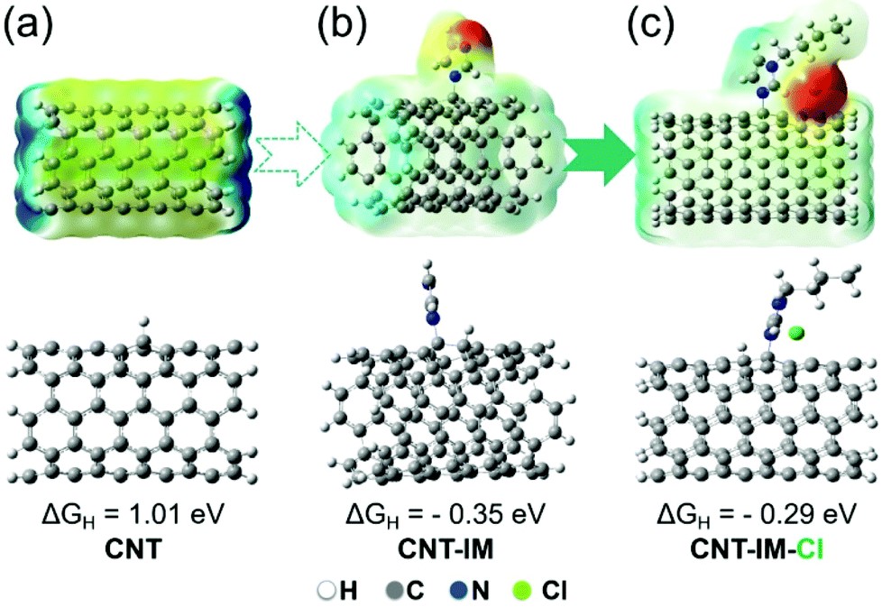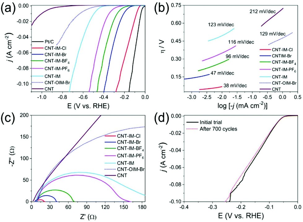 研究表明,原位制备的IL-CNTsIL直接与CNTs连接,能够最大程度的影响材料表面电子结构,有利于析氢中的电子转移与反应物吸附,从而获得较好的催化活性。同时通过改变IL的结构等条件,进一步提高催化活性。