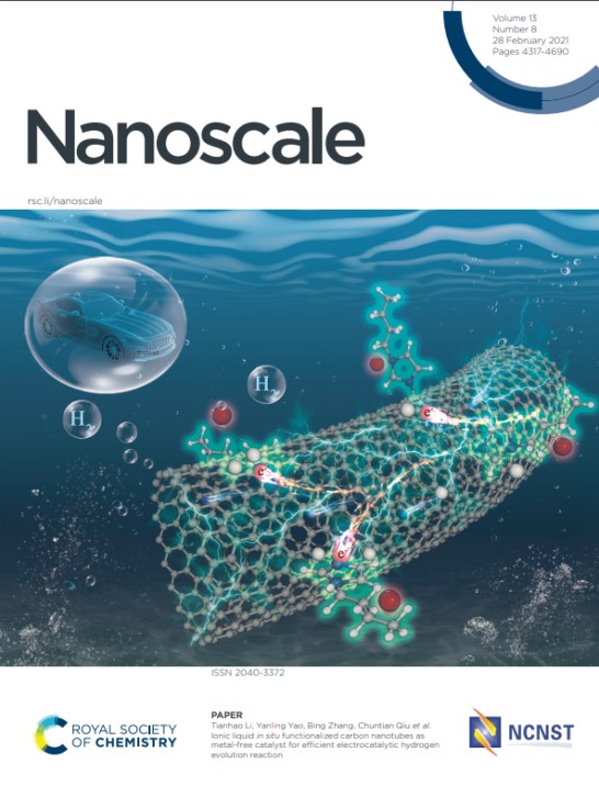 近日,李天浩老师在非金属析氢电催化剂研究方向取得了新进展,相关成果以“Ionic Liquid in-situ Functionalized Carbon Nanotubes as Metal-Free Catalyst for Efficient Electrocatalytic Hydrogen Evolution Reaction为题发表在国际知名期刊《Nanoscale》并被选为封面论文。