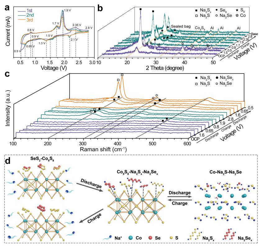 尽管地壳中丰富的钠、硫资源使得室温钠硫电池有望应用于大规模储能系统,但硫导电性差、中间产物穿梭和正极材料体积膨胀严重等问题阻碍了其进一步发展。针对活性物质导电性差的问题,徐茂文教授课题组使用二硫化硒(SeS2)活性物质代替硫,利用导电性强的硒来显著提高活性物质的导电性;其次,针对反应中间体(多硫化钠/多硒化钠)在醚类电解液中严重穿梭等问题,他们提出在金属有机框架衍生物(MOFs)表面原位生长二氧化硅(SiO2)壳进一步制备得到核-壳结构的八硫化九钴(Co9S8@SiO2/C)复合物。将该核-壳结构复合材料用于存储SeS2,一方面能够利用其内部空间有效缓解体积膨胀;另一方面,复合物内部的硫化物颗粒和外层的SiO2壳能够同时发挥吸附作用,有效吸附充放电过程中生成的多硫化钠/多硒化钠。此外,徐茂文教授课题组还利用了一系列原位/非原位表征,探究和分析了正极载体材料和活性物质在充放电过程中的具体变化过程和机理,为室温Na-SeS2电池的进一步研究奠定基础。