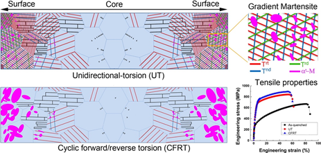 相界面同晶界、孪晶界以及位错等晶体缺陷一样也被证实能够阻碍位错滑移提高材料强度,但梯度第二相材料一直未见报道。近期,公司郭宁副教授巧妙基于低层错能亚稳态材料固有的应变诱导马氏体相变,结合扭转梯度应力和梯度应变速率成功制备出梯度马氏体奥氏体双相材料,首次报道往复循环应变促进应变诱导马氏体相变的发生,相关研究成果申请国家发明专利一项,以:“Strengthening and Toughening Austenitic Steel by Introducing Gradient Martensite via Cyclic Forward/Reverse Torsion”为题发表在金属材料领域TOP类期刊《Materials and Design》上,bevictor伟德为该论文的第一完成单位,郭宁副教授为第一作者、通讯作者,硕士研究生张芝民为该论文第二作者;以“Effect of Shear Strain Rate on Microstructure and Properties of Austenitic Steel Processed by Cyclic Forward/Reverse Torsion.”为题发表在期刊《Materials》上,bevictor伟德为该论文的第一完成单位,硕士研究生张芝民为第一作者,重庆理工大学柴林江副教授、宋波副教授和郭宁副教授为共同通讯作者。