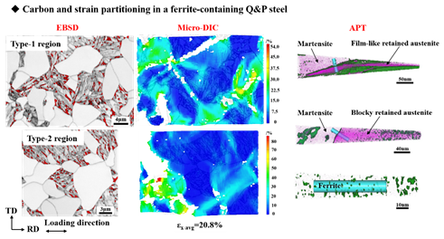 随着汽车轻量化的持续推进,汽车用钢不断向高强高塑性方向发展,由此催生出了汽车用先进高强钢(AHSS)。当前,汽车用AHSS已发展到第三代,最具代表性的钢种之一就是淬火配分(Q&P)钢。该论文针对含铁素体型Q&P钢中TRIP效应有效性低和软硬相协调变形性差的问题,运用准原位拉伸与微观DICEBSD技术相结合的方法,重点研究了软硬相应变配分与TRIP效应和强塑性之间的关系。同时,利用APT技术对含铁素体型Q&P钢中各相之间的碳配分展开了系统定量研究。在上述研究基础上提出了基于碳配分及应变配分控制的含铁素体型Q&P钢组织性能综合调优策略。该研究结果得到国内外同行的一致认可。