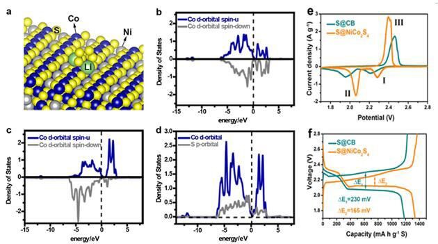 锂硫电池被认为是下一代能量存储系统之一。然而,由于活性物质硫及其放电产物硫化锂导电性差,放电过程中的体积膨胀,以及多硫化物溶解等问题,致使电池比容量较低,容量衰减快,倍率性能差,严重阻碍了锂硫电池的商业化进程。针对这些问题,徐茂文教授课题组设计并合成了由空心纳米管组成的相互交联的中国结状NiCo2S4作为硫的载体,提高了锂硫电池的电极材料的循环稳定性和比容量。良好的电化学性能主要归因于:(i) 一维的纳米管相互穿插形成独特的中国结状结构,促进了电子的快速传导;(ii)空心的管状结构在放电过程中可以缓解硫的体积膨胀,限制多硫化物的溶解,提高电池的循环稳定性;(iii) 实验和理论计算表明,NiCo2S4不但可以吸附极性的多硫化物,通过化学作用,抑制多硫化物之间的溶解,还可以催化多硫化物之间的转化反应。