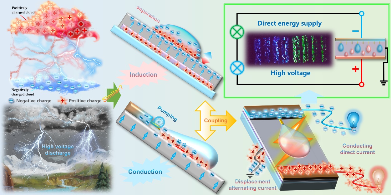 摩擦纳米发电机(TENG)拉开了高熵能量收集的序幕,并逐渐应用于液滴能量收集。接触带电(CE)和静电感应(EI)已被证明是TENGs中的基本过程,CE普遍存在于固-固和固-液体系中并以电子转移为主,而EI在将内部位移电流转换为外电路中的容性导电流方面起着至关重要的作用。由于界面没有电荷转移,因此常规TENG的输出通常具有交流(AC)特性。而基于CE和EI的TENG已经取得了巨大的成功,在许多领域展示了它们的巨大潜力。由于CE和EI在解释固-固TENGs的工作原理方面取得了巨大成功,因此它们自然而然地被用于解释固-液TENGs,特别是那些具有交流输出的液滴纳米发电机(AC-DNGs)。但在新开发的直流输出DNGs(DC-DNGs)中,水滴电荷的命运被重新讨论:负电荷从水转移到电极,形成阻性传导电流。AC-DNG和DC-DNG 中有争议的解释促使我们深入研究CE和EI产生的电荷的命运。是否可以区分水/电极界面上电荷的命运:是AC-DNGs中提出的电荷与电极界面积累,抑或是DC-DNGs中存在的电荷转移?