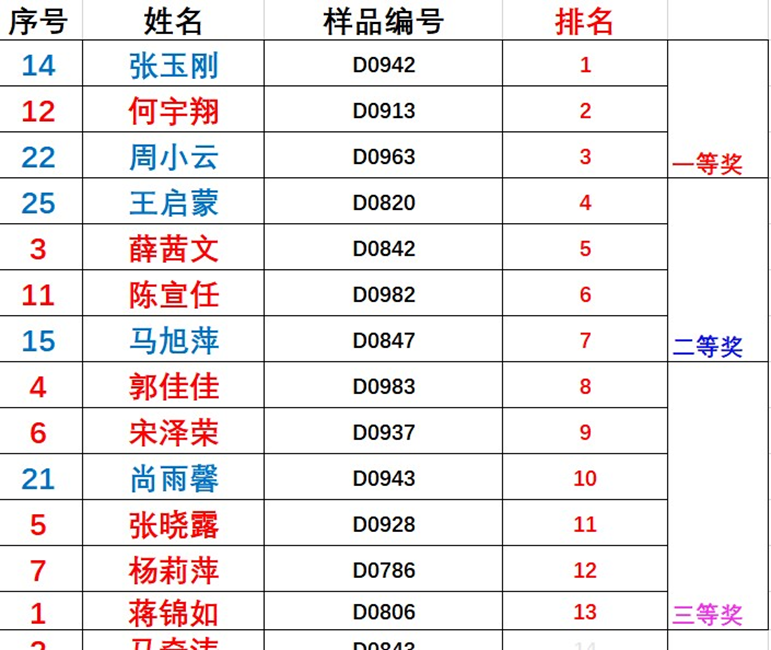 比赛分为A、B两组进行。经5位公司专业评委双盲评分,最终评选出3个一等奖、4个二等奖、6个三等奖,具体名单如下。公司拟排出本次校赛成绩位列前茅的同学参加6月份在重庆大学举办的重庆市复赛(前8名)和8月份在郑州大学举办的国赛(待定)。