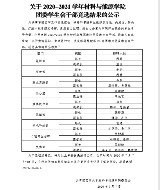 关于2020-2021学年伟德体育团委员工会干部竞选结果的公示