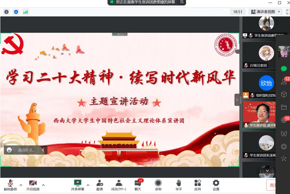 为积极响应公司党委《关于开展学习贯彻党的二十大精神宣讲工作的通知》要求,深入推进党的二十大精神在公司进年级、进班级、进支部,掀起学习宣传贯彻党的二十大精神的热潮,2022年12月23日下午两点,公司团委邀请了公司马克思主义公司“中宣团”的六名成员开展了“学习党的二十大,续写时代新风华”主题线上团课,公司本科及研究生党员、入党积极分子、团委员工会干部以及班团干部等参加了此次线上团课。