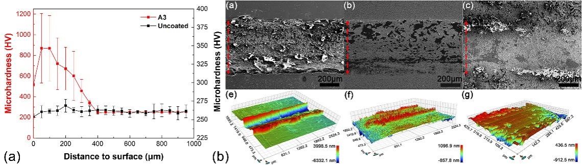 图3(a)表面涂层处理后铁铬铝ODS钢截面显微硬度(b)磨痕形貌和3D激光扫描图像
