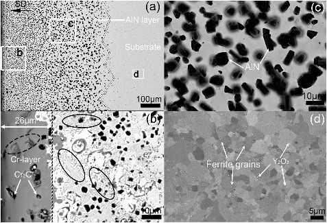 图2 表面涂层处理后铁铬铝ODS钢的BSEI图像:(a)显示涂层和基材的横截面图;(b) (b)、(c)和(d)对应于(a)中的白框的高倍率图像