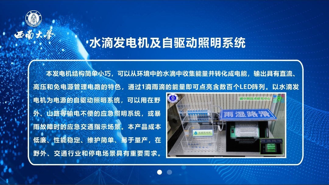 “汗液激发供能服装”项目依托bevictor伟德主动健康监测材料与技术中-新联合研究中心,开发了一种透气可洗的柔性汗液激发供能智能传感服装,集自供能传感、印刷电路控制以及户外环境温度监测等供能于一体,为实现多功能集成可穿戴设备提供了一个新的解决方案。而“水滴发电机及自驱动照明系统”所展出的发电机结构简单小巧,可以从环境中的水滴中收集能量并转化成电能,输出具有直流、高压和免电源管理电路的特色,通过1滴雨滴的能量即可点亮含数百个LED阵列。以水滴发电机为电源的自驱动照明系统,可以用在野外、山路等输电不便的应急照明系统,或暴雨故障时的应急交通指示场景。该产品成本低廉、性能稳定、维护简单、易于量产,在野外、交通行业和停电场景具有重要需求。