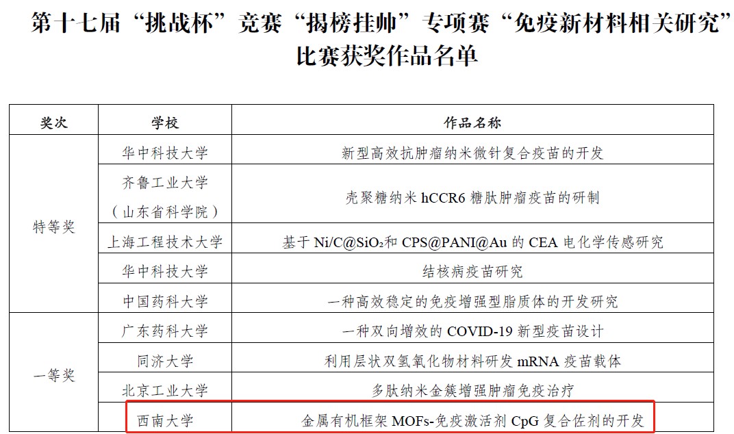 近日,第十七届“挑战杯”全国老员工课外学术科技作品竞赛(以下简称“‘挑战杯’竞赛”)“揭榜挂帅”专项赛“高效率球形钛合金粉末制备新原理新工艺研究”和“免疫新材料相关研究”比赛获奖作品揭晓,经评审委员会资格审查、初审和复审,公司2项员工作品脱颖而出,取得优异成绩,其中李婧老师和蒋显全教授指导的员工团队(作品名称:高效率球形钛合金粉末制备新原理工艺研究)斩获特等奖,刘英帅教授指导的员工团队(作品名称:金属有机框架MOFs-免疫激活剂CpG 复合佐剂的开发)荣获一等奖。