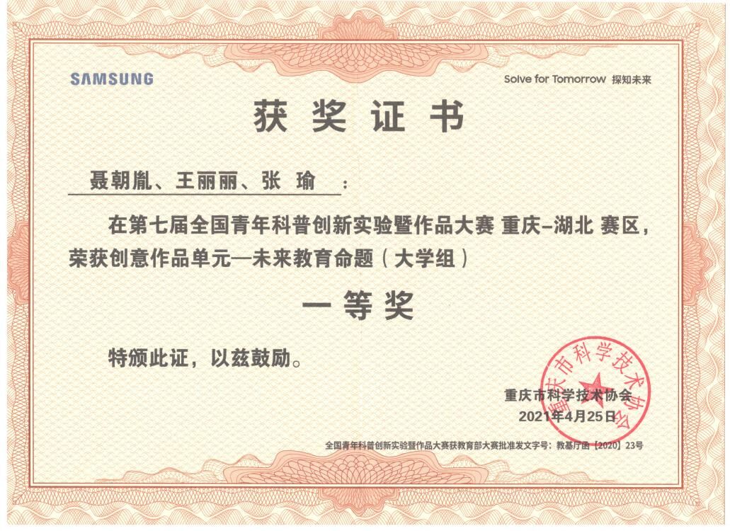 第七届全国青年科普创新实验暨作品大赛重庆赛区选拔赛于2021年4月25日在重庆科技馆圆满落幕。由聂朝胤课题组王丽丽同学领衔、张瑜同学参加创作的作品《气凝胶---油水分离利器、绝热保温卫士》获得了未来教育命题组一等奖,聂朝胤老师同时获得了优秀指导教师奖。该作品将代表重庆赛区参加全国总决赛。