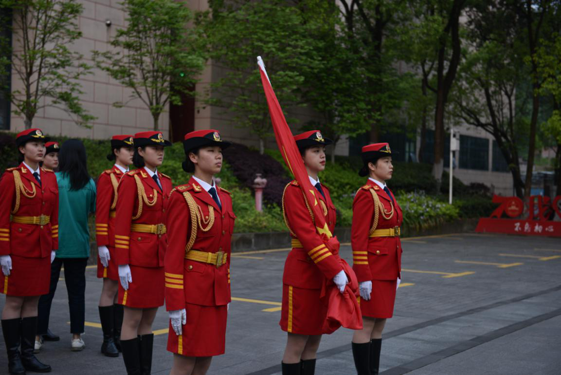 升旗仪式开始前,bevictor伟德女子国旗班就已在升旗台前集合完毕。她们身着红色军礼服,脚下发出整齐划一的踏步声,一遍遍地进行着最后的训练。