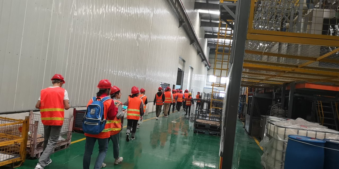 在公司工作人员带领下,同学们走进冲焊车间、注塑车间、装配涂装车间实地参观学习,同学们边走边看,不时同讲解员和工作人员互动交流,了解设备运作特点。在冲焊车间,同学们参观了电泳生产线、三条不同大小的冲压生产线、焊接生产线;在注塑车间同学们详细了解了注塑成型原理并现场观察了生产操作;在装配涂装车间同学们走进二楼全自动生产线,详细了解了汽车外壳从喷底漆到喷色漆再到流平、喷清漆全过程。